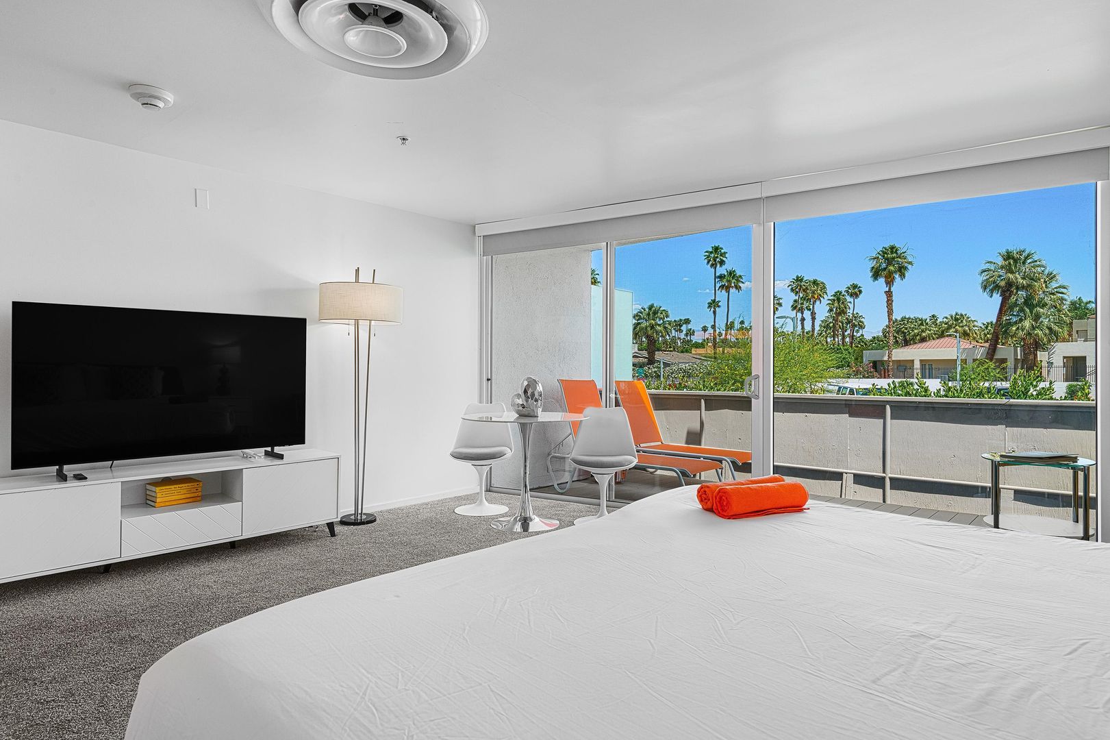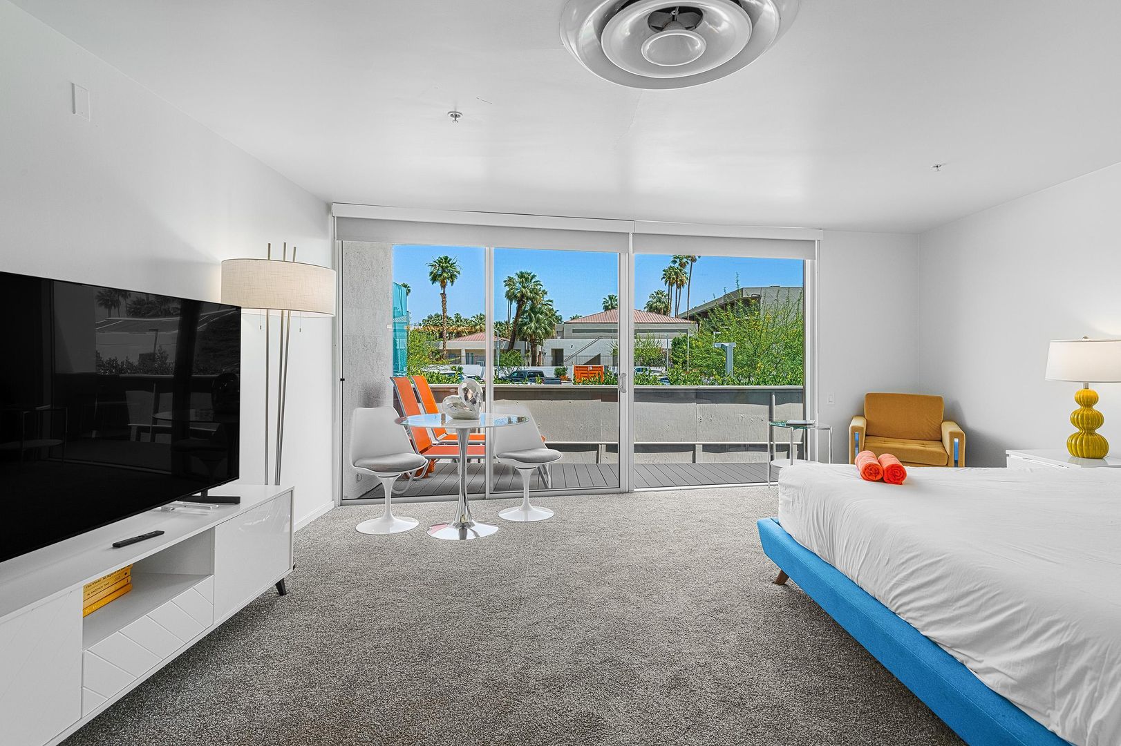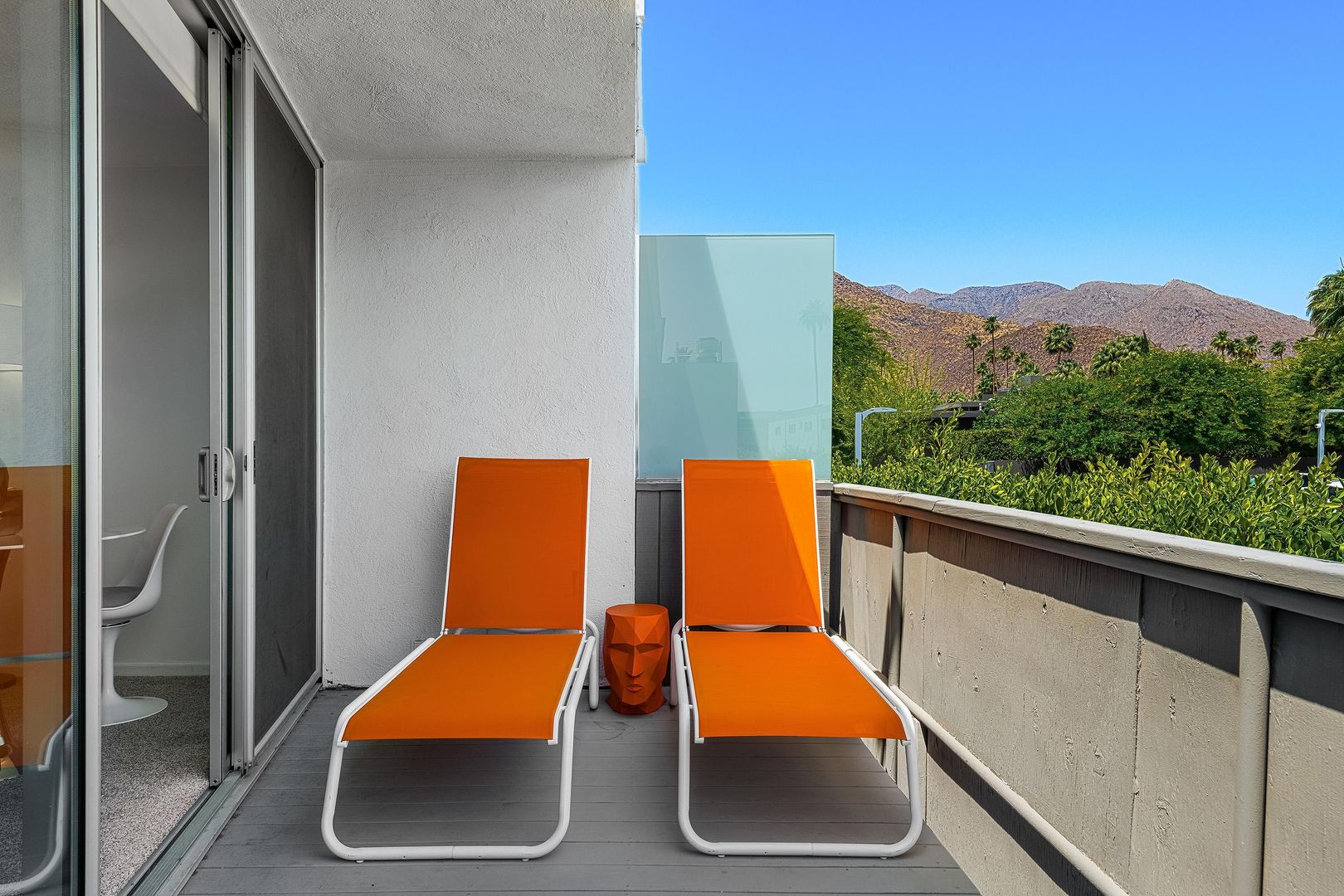 Discover the ultimate blend of comfort and style in this fully furnished studio apartment available for rent in the heart of Palm Springs. Situated in the vibrant Uptown Design District, this 629 sq. ft. gem offers a perfect retreat with a 30-day minimum stay requirement. Step inside to find a spacious layout featuring a full kitchen equipped with a dishwasher, making meal preparation a breeze. The living area extends to a private patio where you can unwind under orange umbrellas and awnings, enjoying the stunning views of the San Jacinto Mountains.