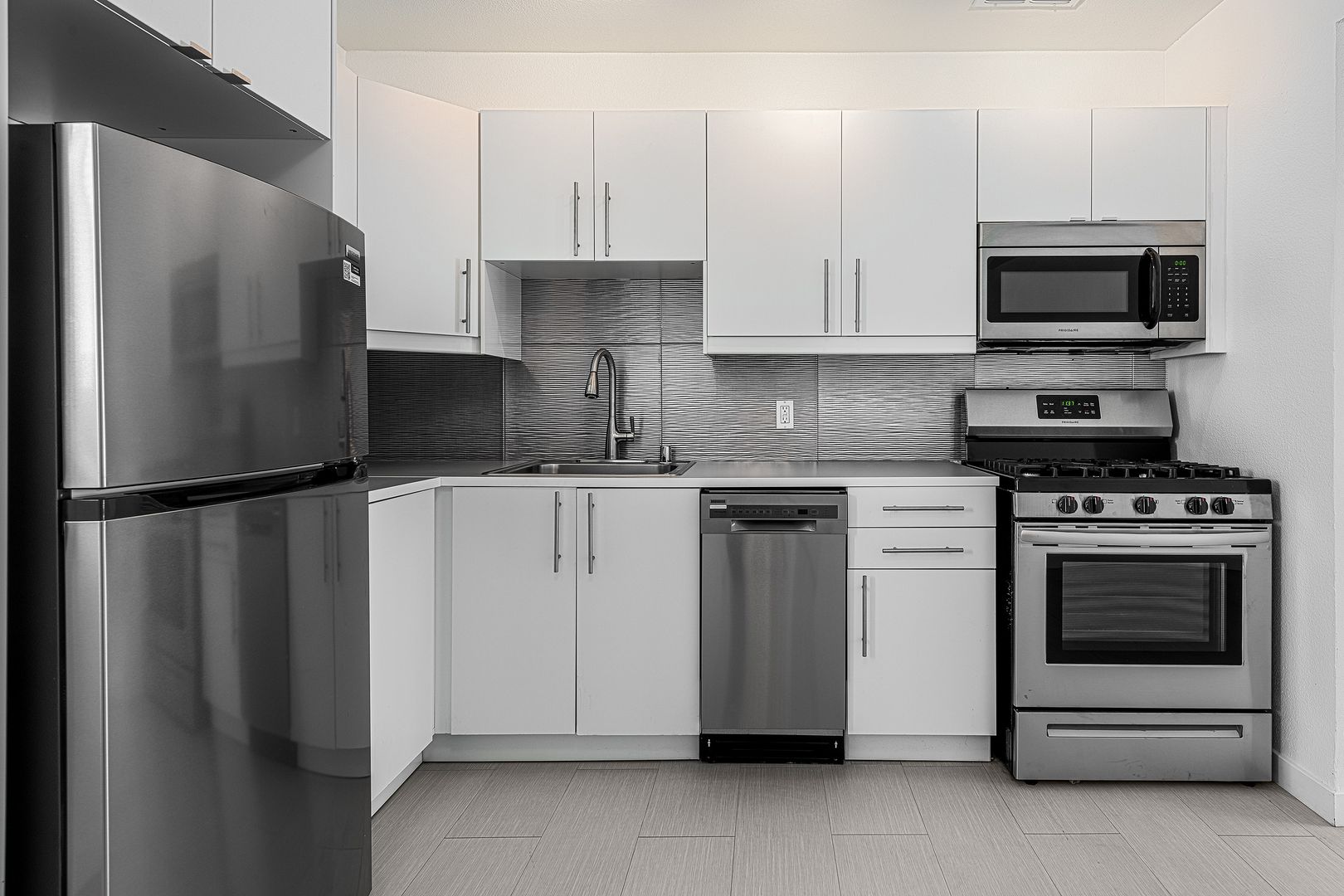 The kitchen: Modern style with plenty of cabinetry. Appliances include a built-in microwave, dishwasher, refrigerator, and gas range. A faux metal backsplash compliments the stainless steel appliances.