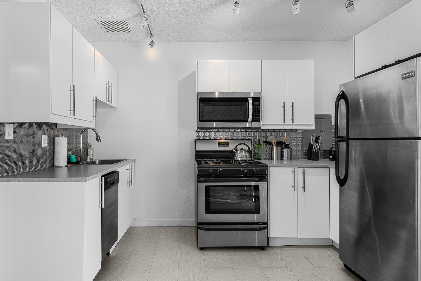 **The Kitchen**: Modern and sleek, featuring ample cabinetry, a built-in microwave, dishwasher, refrigerator, and gas range. The faux metal backsplash complements the stainless steel appliances, creating a chic, cohesive look.